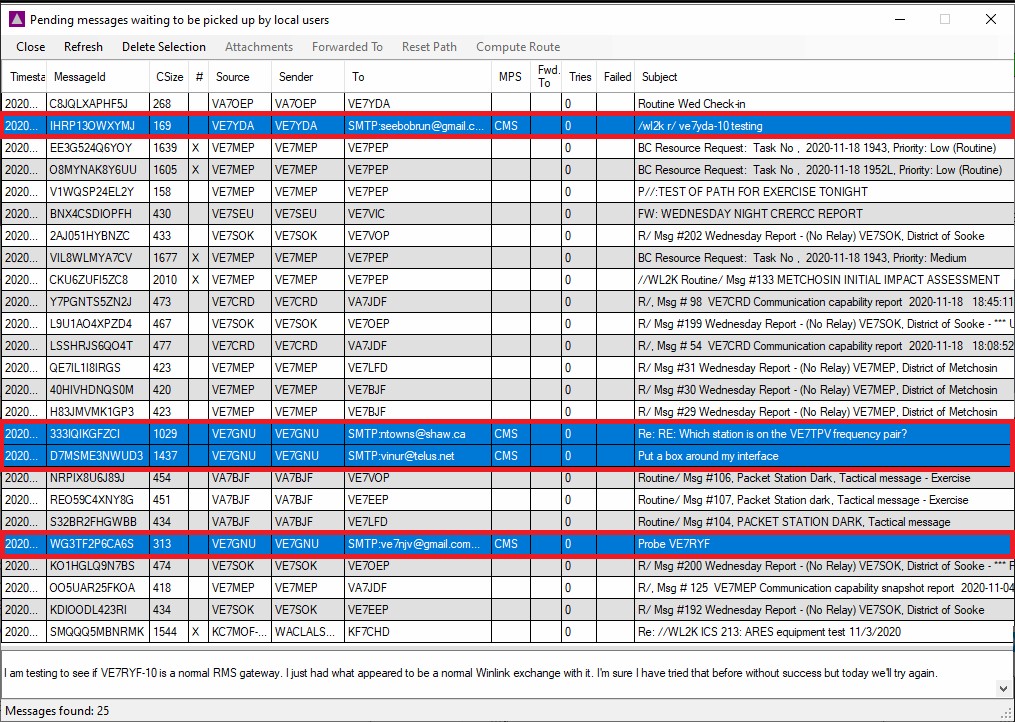 Highlighted messages: The message sender has assumed that VE7RYF-10 is connected to the Internet and the CMS/AWS was available. (learning process)